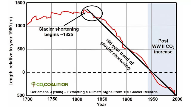 CO2 Coalition 's " Fact #11 " (together with " Fact #12 ") claim that a "tipping point" occurred in 1800 that caused mountain glaciers to melt (and sea levels to rise), and since this "tipping point" occurred before major increases in CO2, both the glacial melting and sea level rise "are directly the result of the natural warming that began in the late 17th-century." They assert that glacial retreat (and sea level rise) "continues at about the same rate today as it was 150 years ago." The graph they use to support this claim was taken from Oerlemans 2005[1] with their own annotations. The paper they reference is pretty interesting, though there is absolutely no claim in the paper of any "tipping point" in 1800, and the "190-year trend of glacier shortening" is an annotation of CO2 Coalition, not a claim of the paper. The actual graph from the paper shows no "tipping point" but a gradual accele...